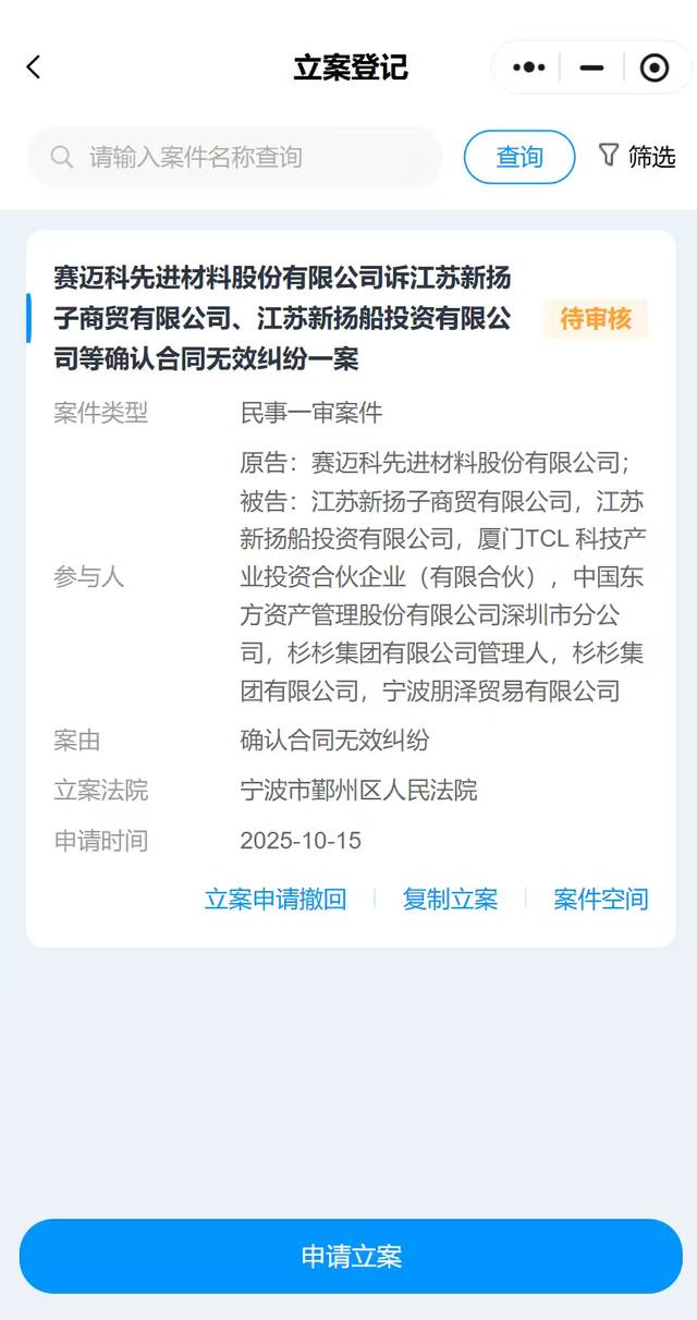 一家在公开招标遴选原本已进入杉杉集团重整案相关联合投资体的企业——赛迈科材料公司,声称最后一刻却被莫名踢出。更为核心的是,这家名为赛迈科材料的公司主营特种石墨材料和碳基复合材料,与杉杉股份的新能源主营业务在产业链上高度协同,且已进入上市辅导期。
