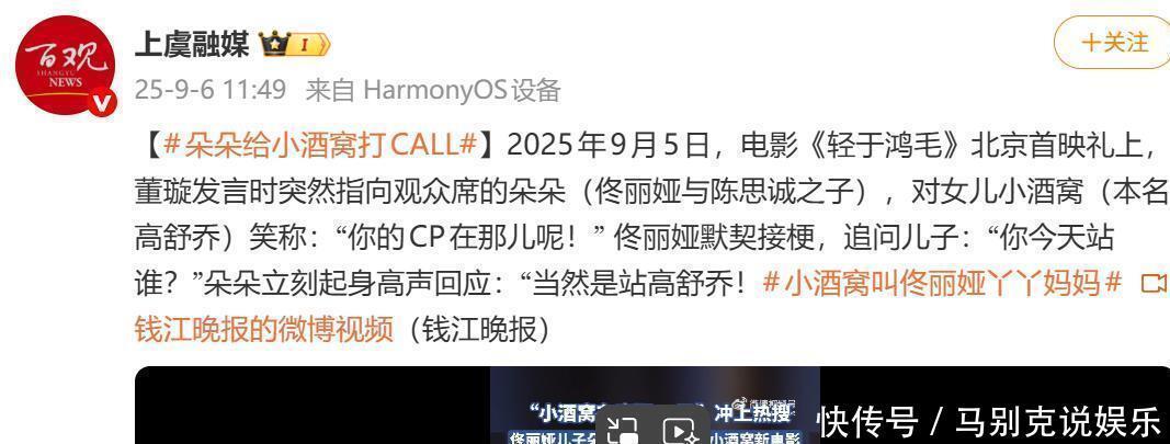 他们的儿子朵朵在今年9月《轻于鸿毛》首映礼上的表现更是让人吃惊。当佟丽娅鼓励他发言时,这个9岁的孩子毫不怯场,逻辑清晰地祝福电影票房大卖,还明确表示要“站”好朋友小酒窝。